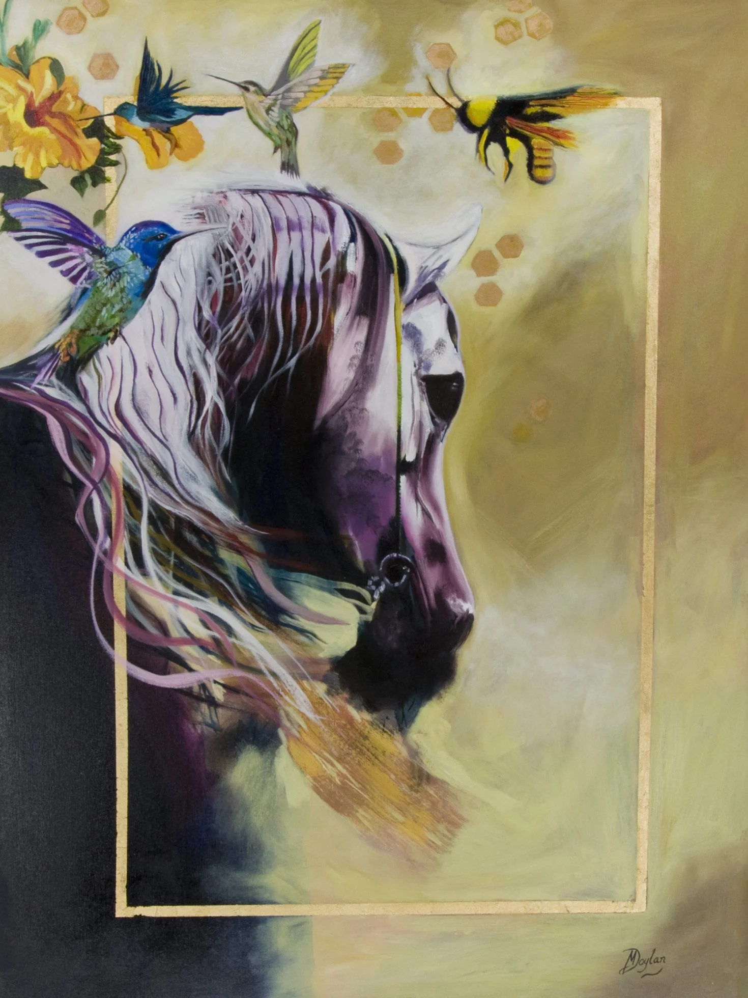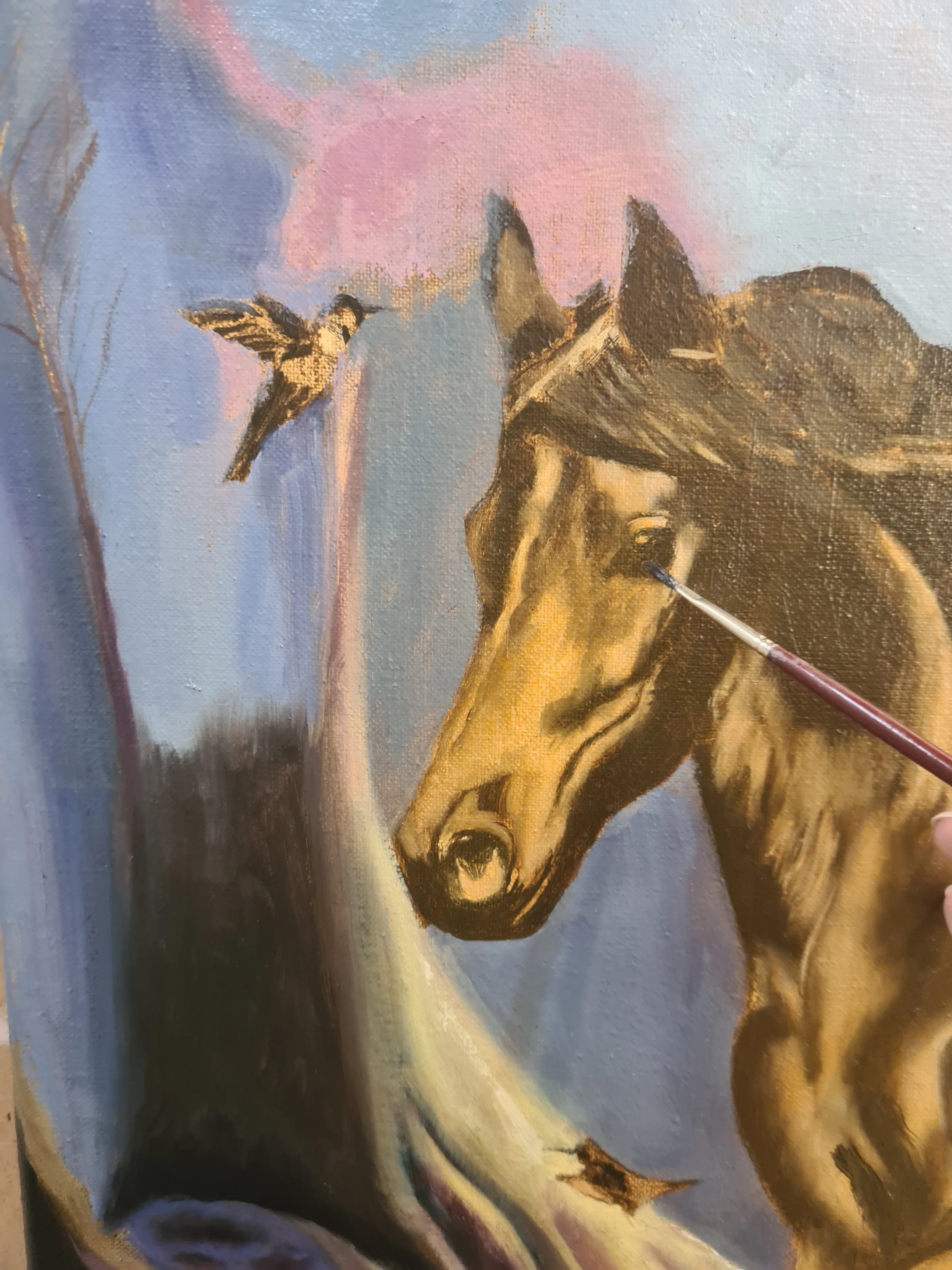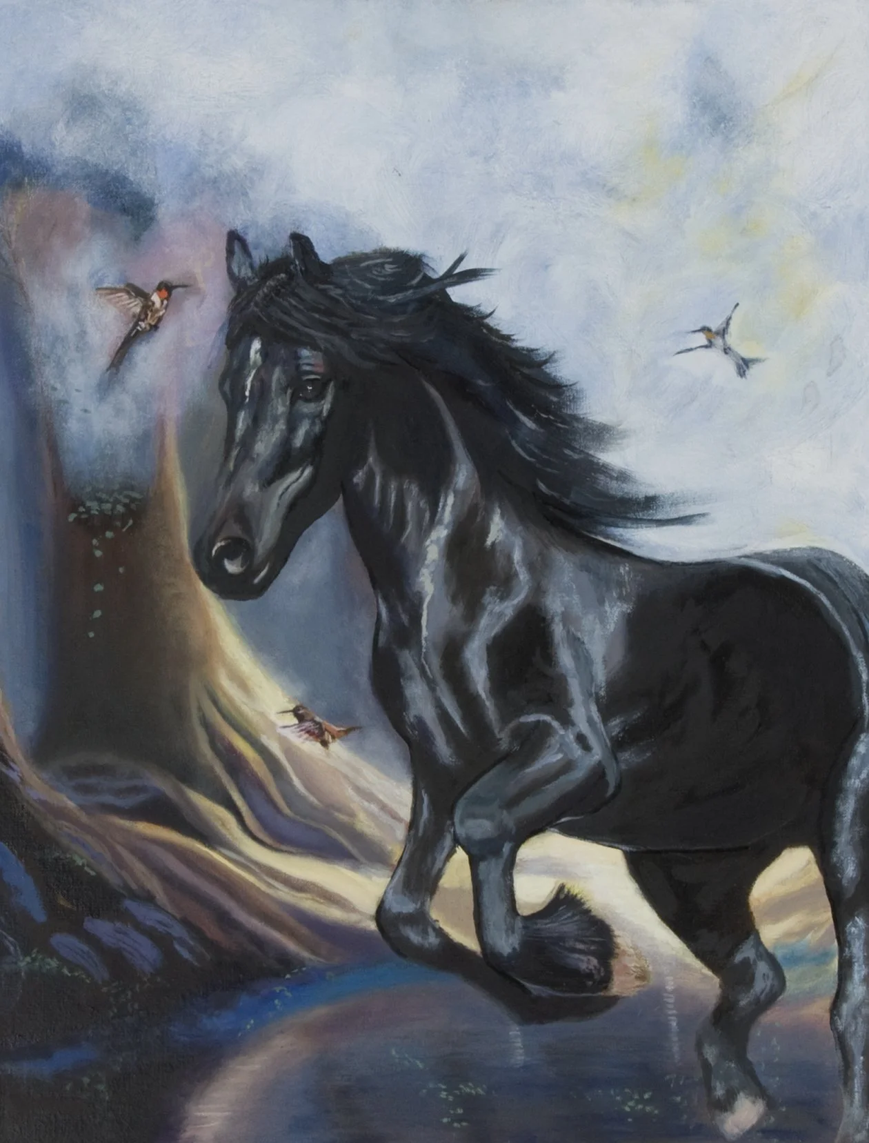 Fleeting Freedom was born from one of those moments. A black horse emerged in my vision, not galloping, but gliding — as if running through a prayer. Her mane moved like water, her hooves barely touched the earth, and around her danced hummingbirds.