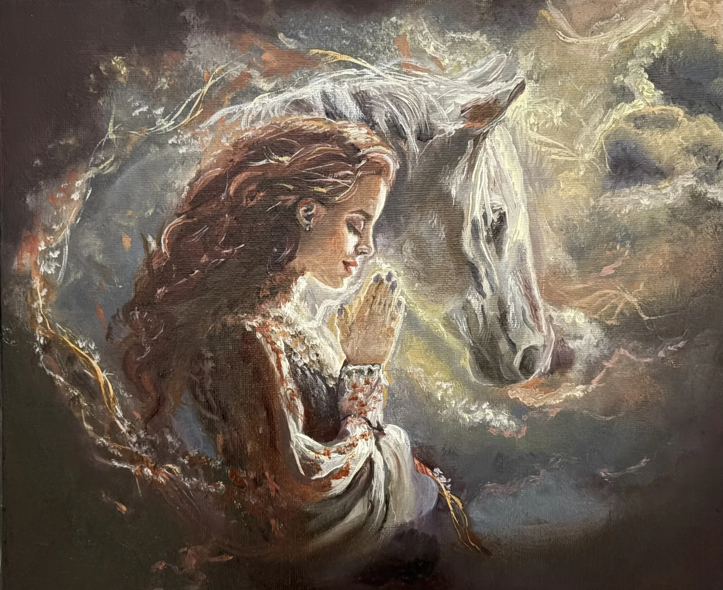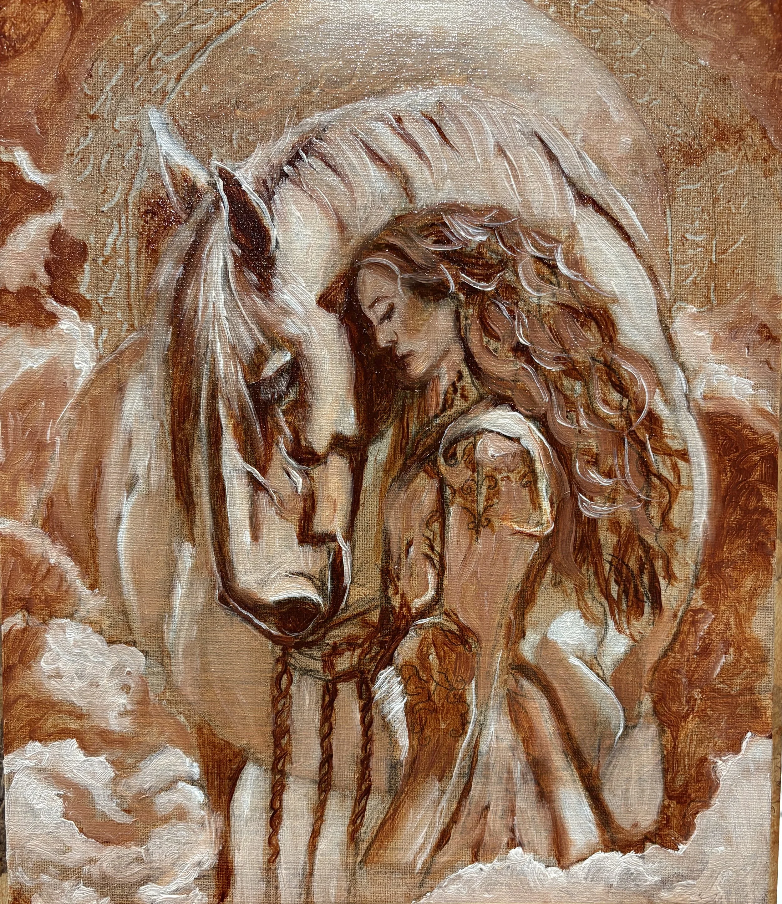 In painting “The First Ascent”, I found myself reaching for a feeling more than an image: the sacred presence that arises when two souls meet without words. The horse’s bowed head and the woman’s closed eyes mirror a silent prayer—not for answers, but for connection. Through this, I am reminded that the Divine often looks like a quiet breath shared in companionship, an invisible thread spun from love and the yearning to ascend.