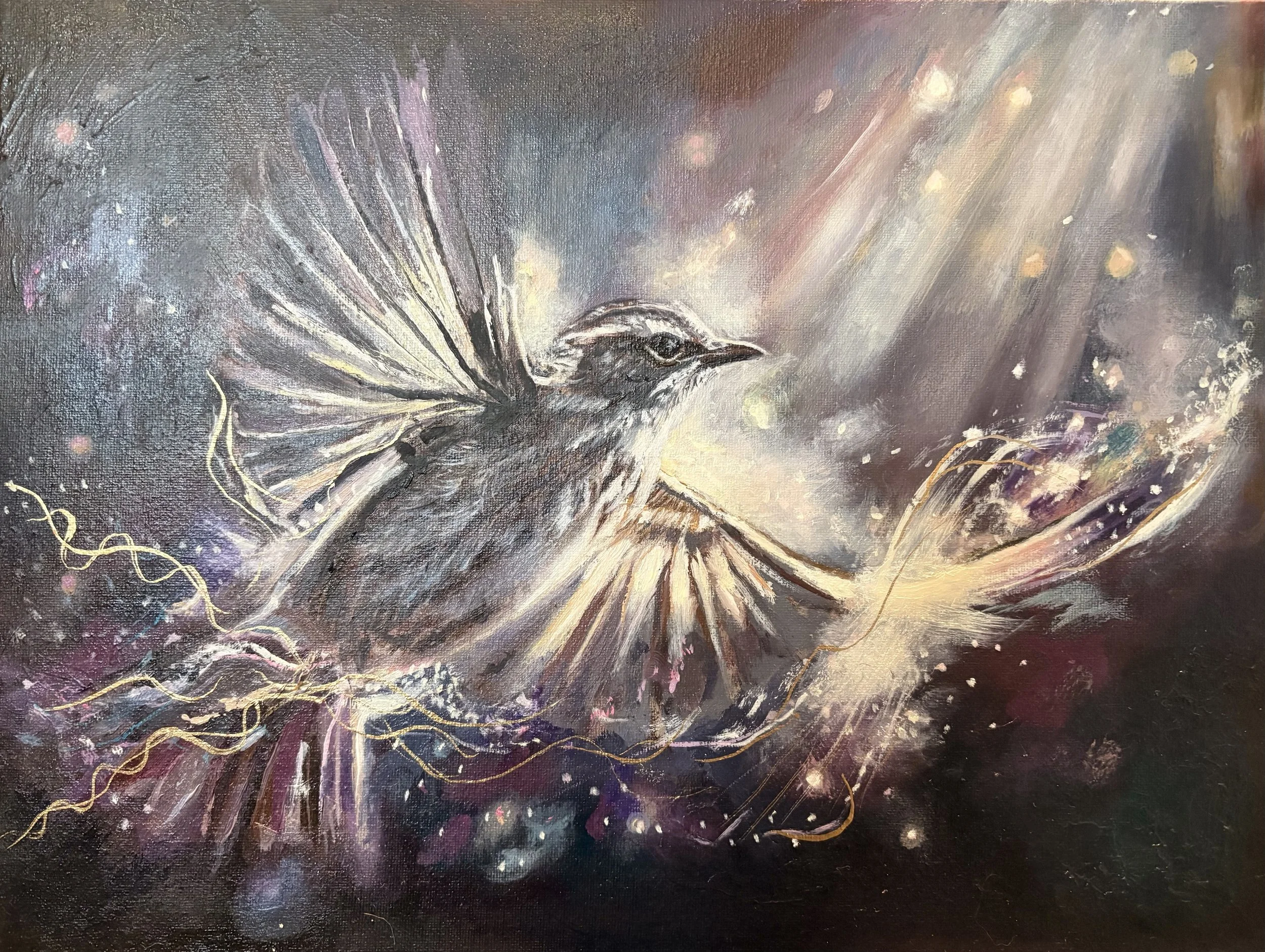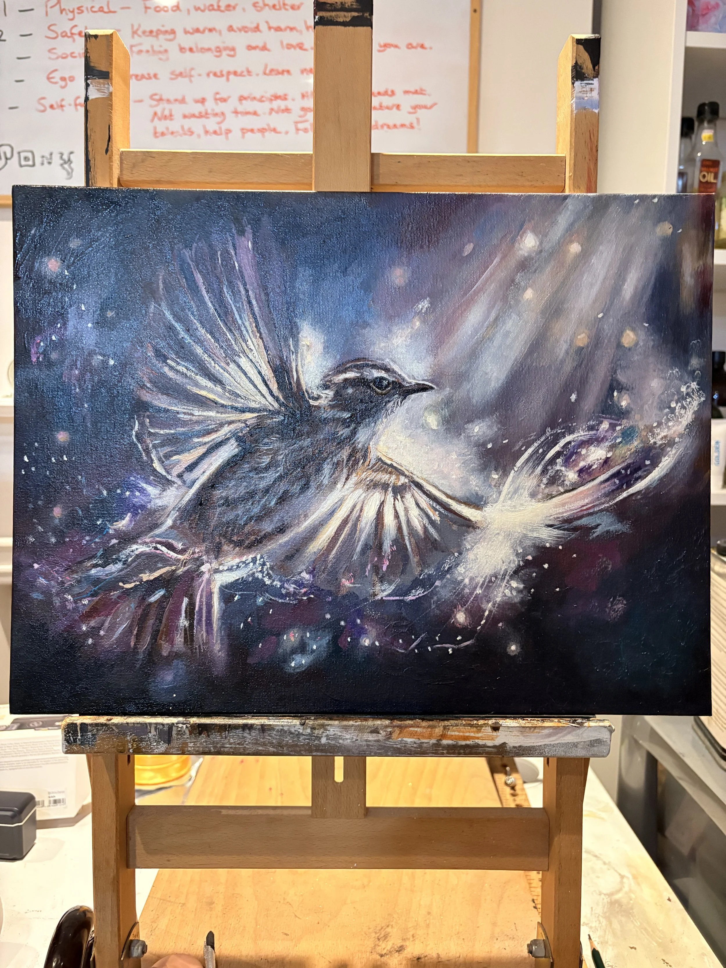 The rich, dark background, speckled with stars, sets the stage for the bird’s graceful form. Its wings, painted with layers of colour and light, suggest movement and freedom, while the golden threads add a touch of magic, hinting at something greater beyond the frame. As I near the end, I find myself refining the details - the subtle glint in the bird’s eye, the texture of its feathers, and the way the threads seem to dance with the starlight. It’s a delicate balance, and I’m savouring every moment of this final stage.