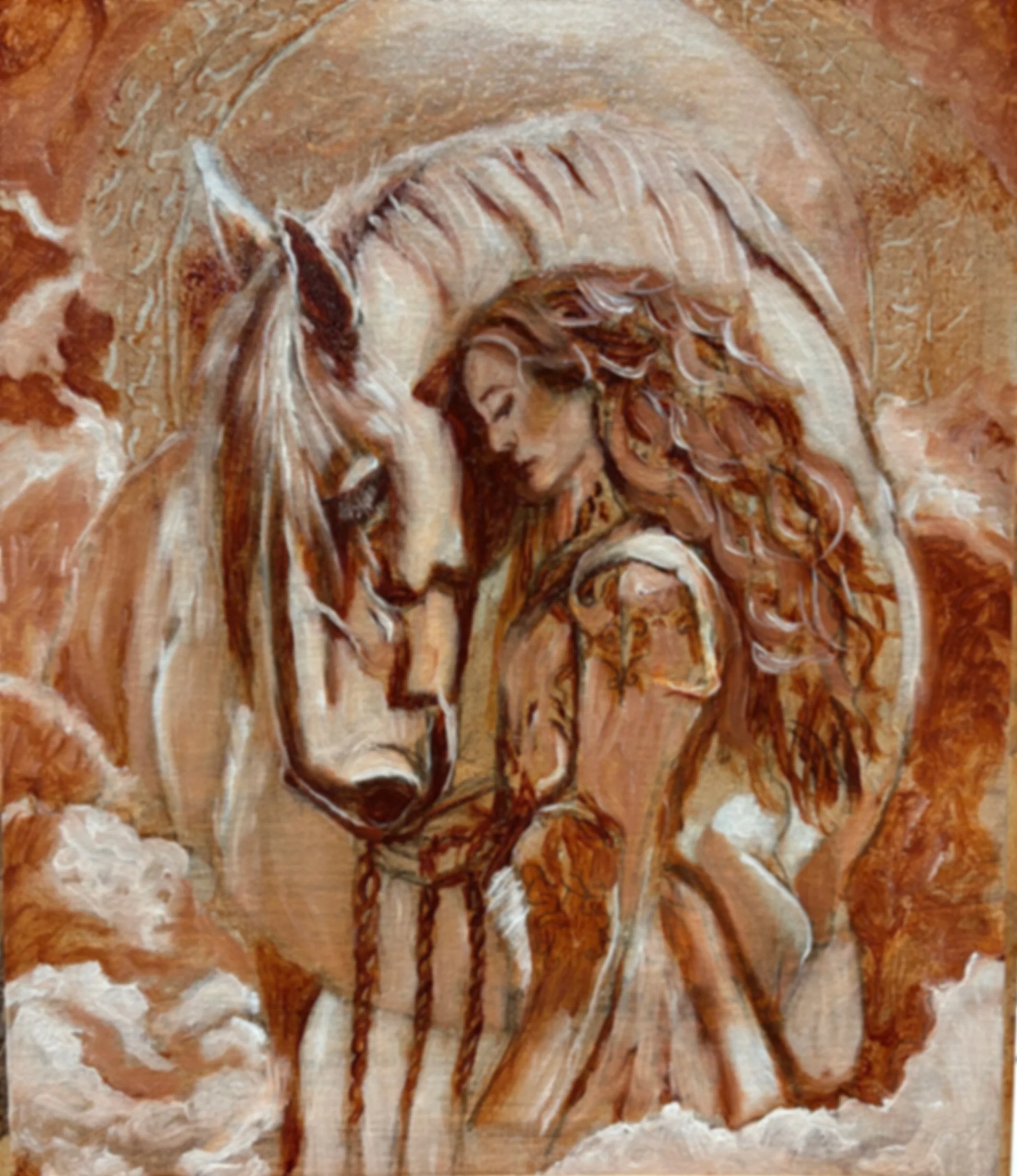 It is no surprise then that my current colour study - an underpainting of a woman and a white horse standing amidst clouds and divine golden light - echoes this lifelong love. In this piece, the woman represents my soul, and the horse, my eternal companion. Golden threads swirl and weave through the sky, symbolising my sacred connection to animals and the divine path they lead me on. It’s a painting of reunion, of return - of where heaven meets earth.