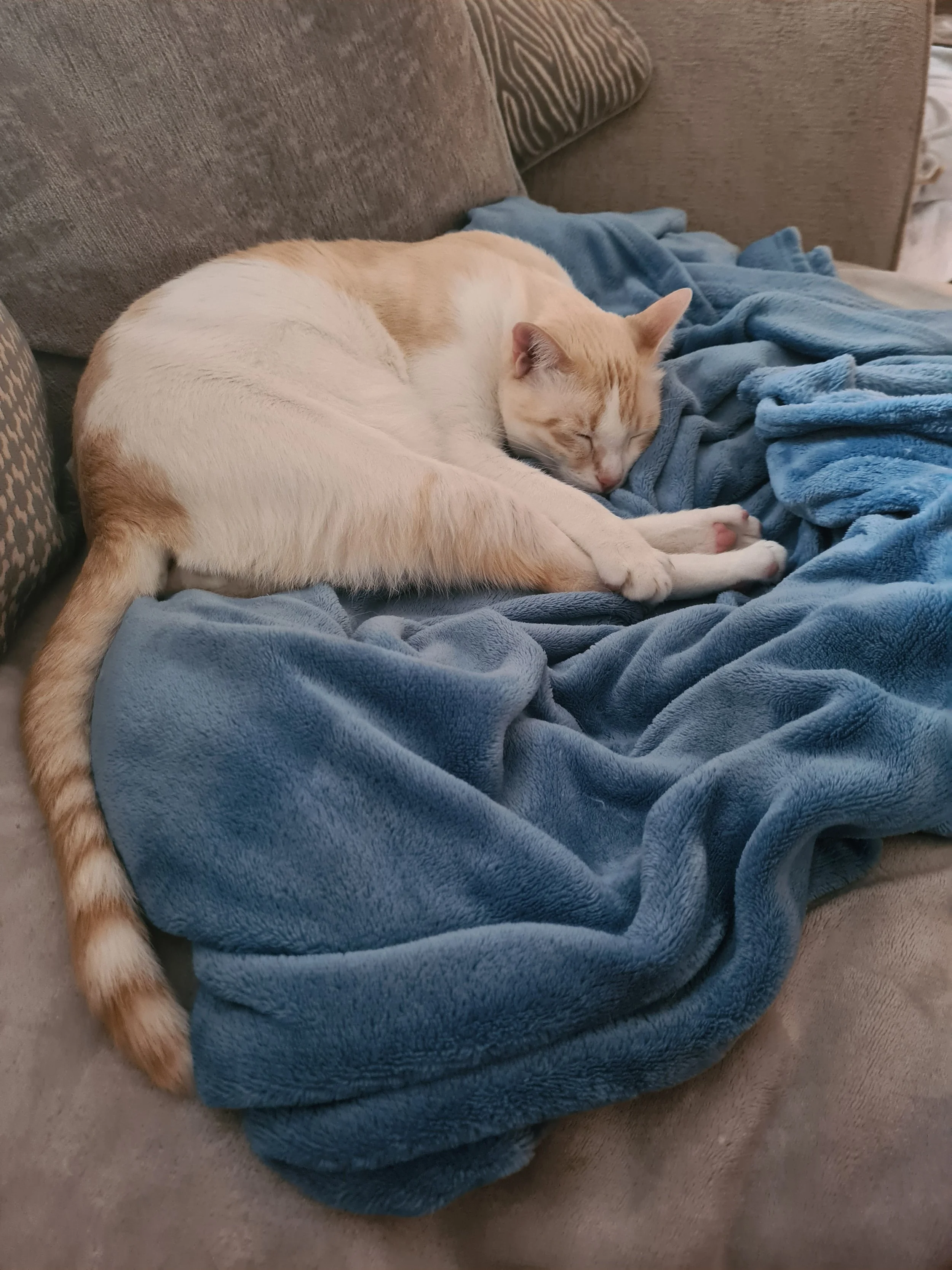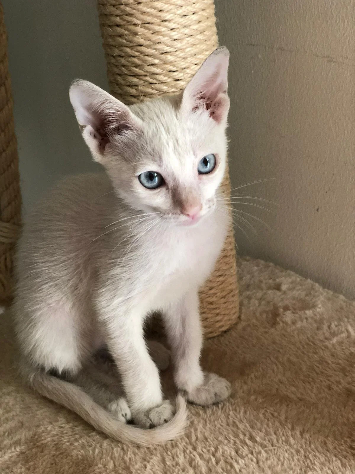 At first, he was snow white, with the clearest blue eyes I’d ever seen. Over time, golden-red markings bloomed on his ears, tail, and nose - revealing that he was a Flame Point cat. The name always felt symbolic to me… as though he carried a flicker of divine fire that had never gone out, no matter how hard life had been.