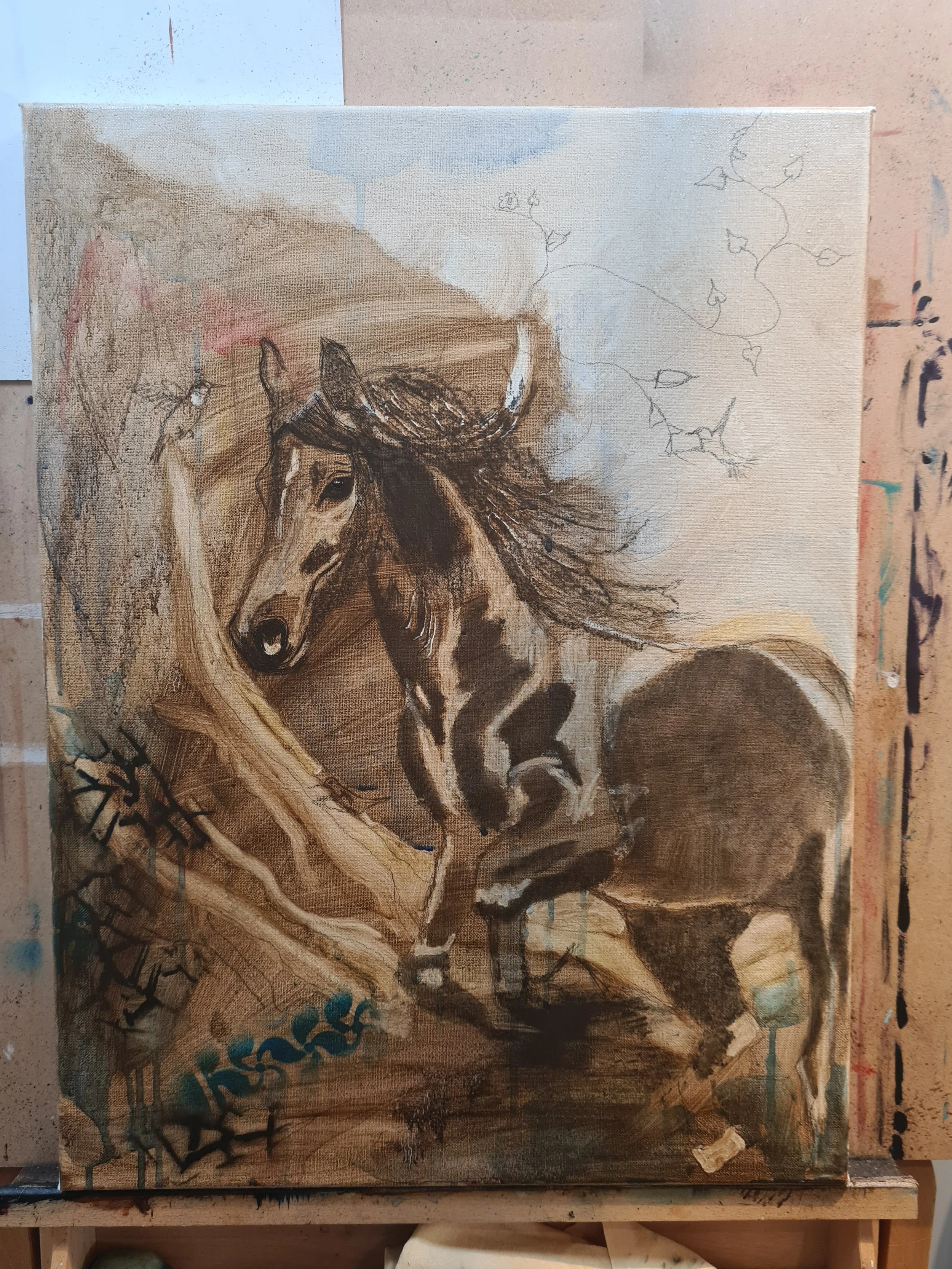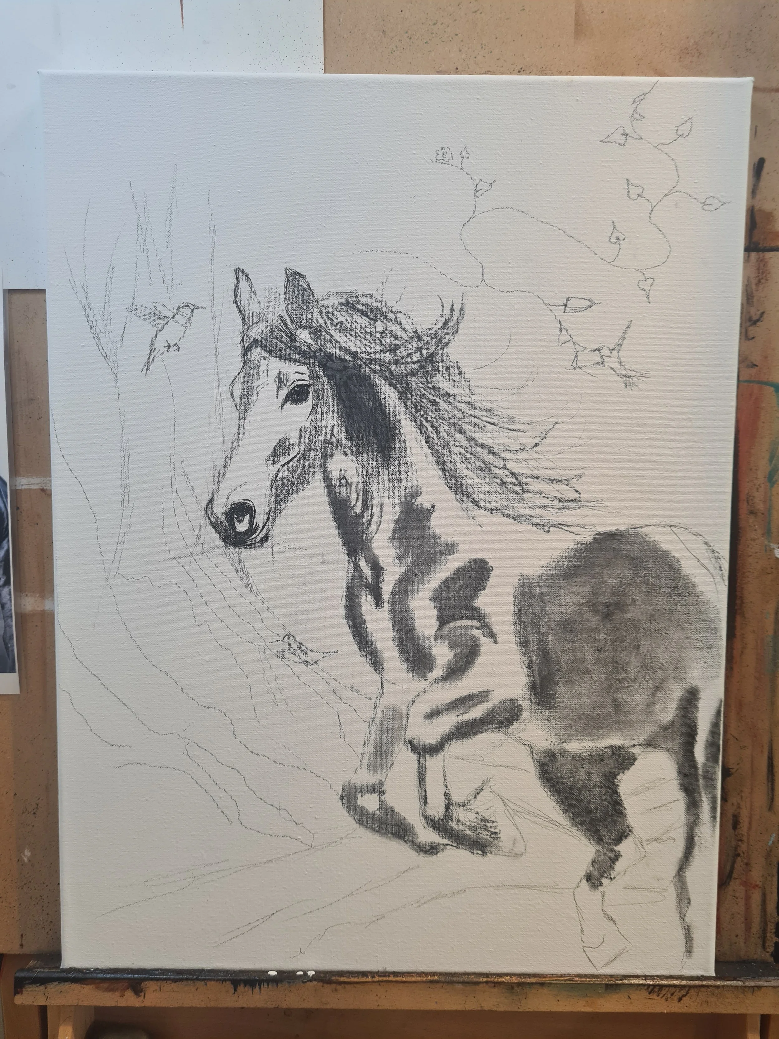 This painting began with the image of a horse caught between two worlds - running not away from anything, but toward the invisible call of something sacred. Before the colour ever touched the canvas, I sketched her in charcoal, letting the movement find its own rhythm. Even then, she already felt alive.