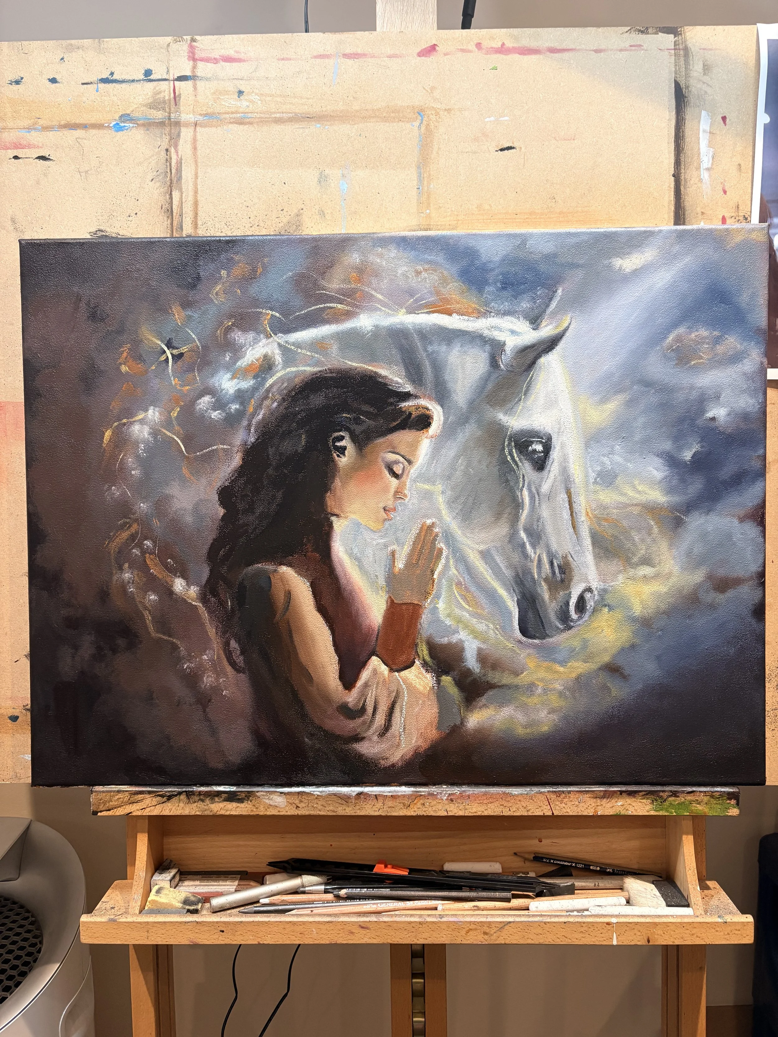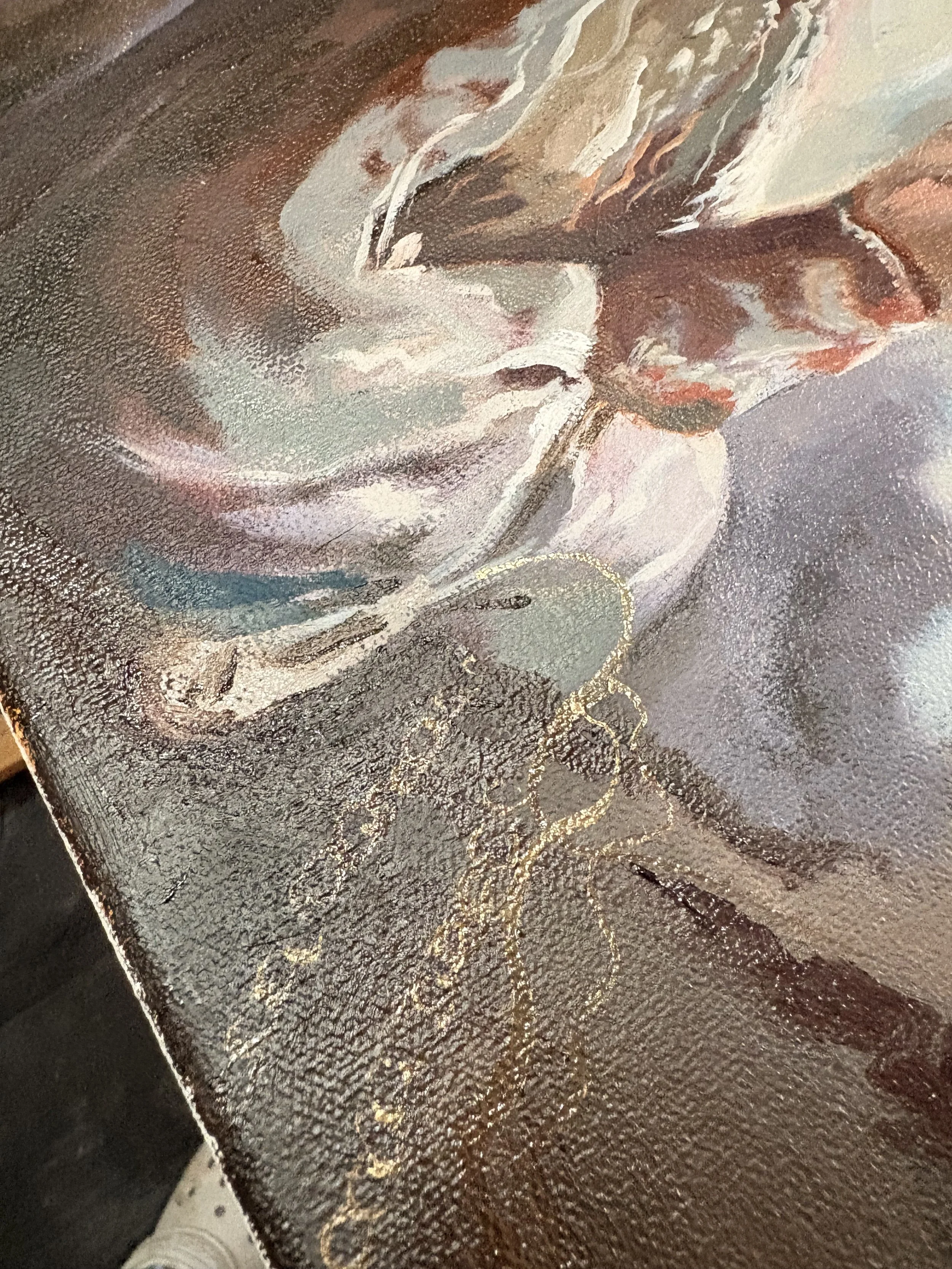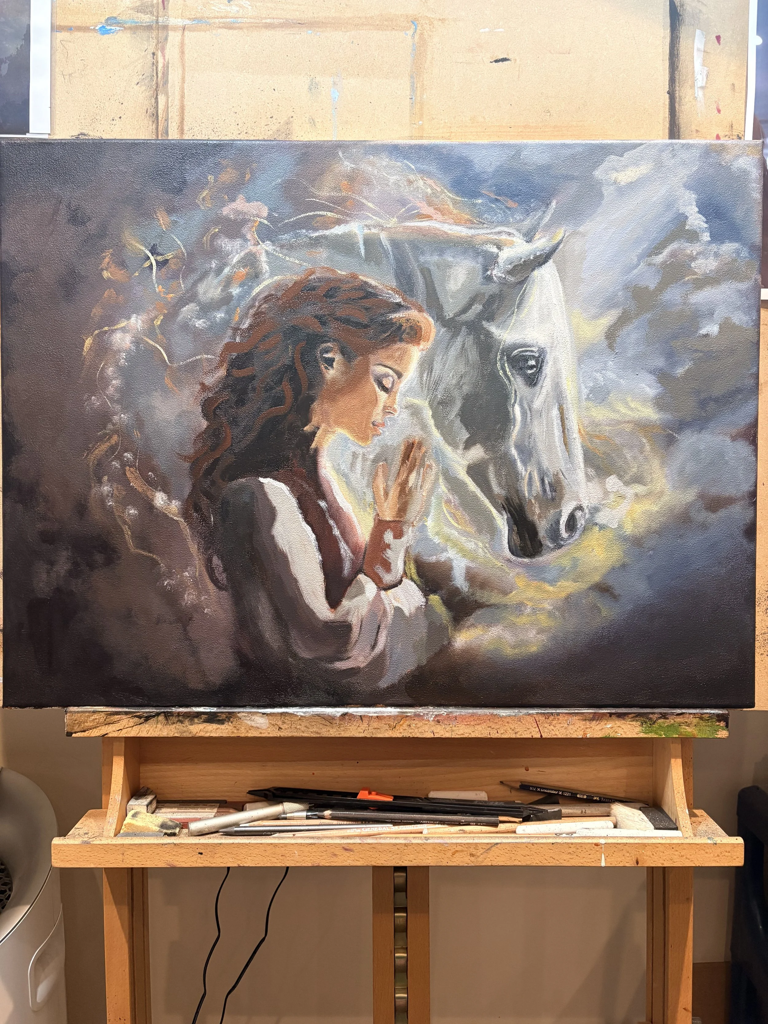 The clouds are still whispering, and the horse is still waiting. This month, I’ve begun refining light across the mane and starting to weave the golden thread toward her, letting it decide its own path on the canvas.