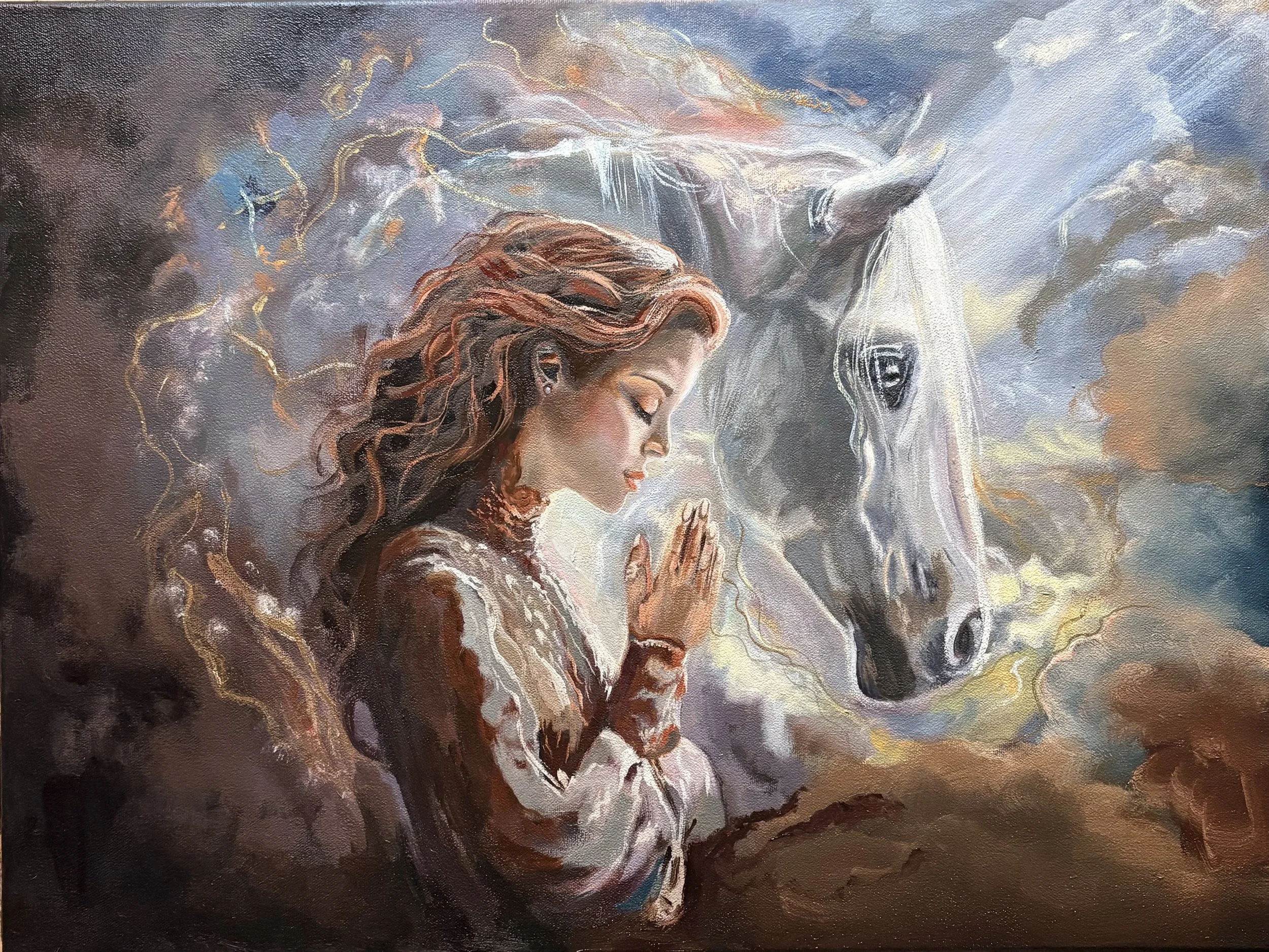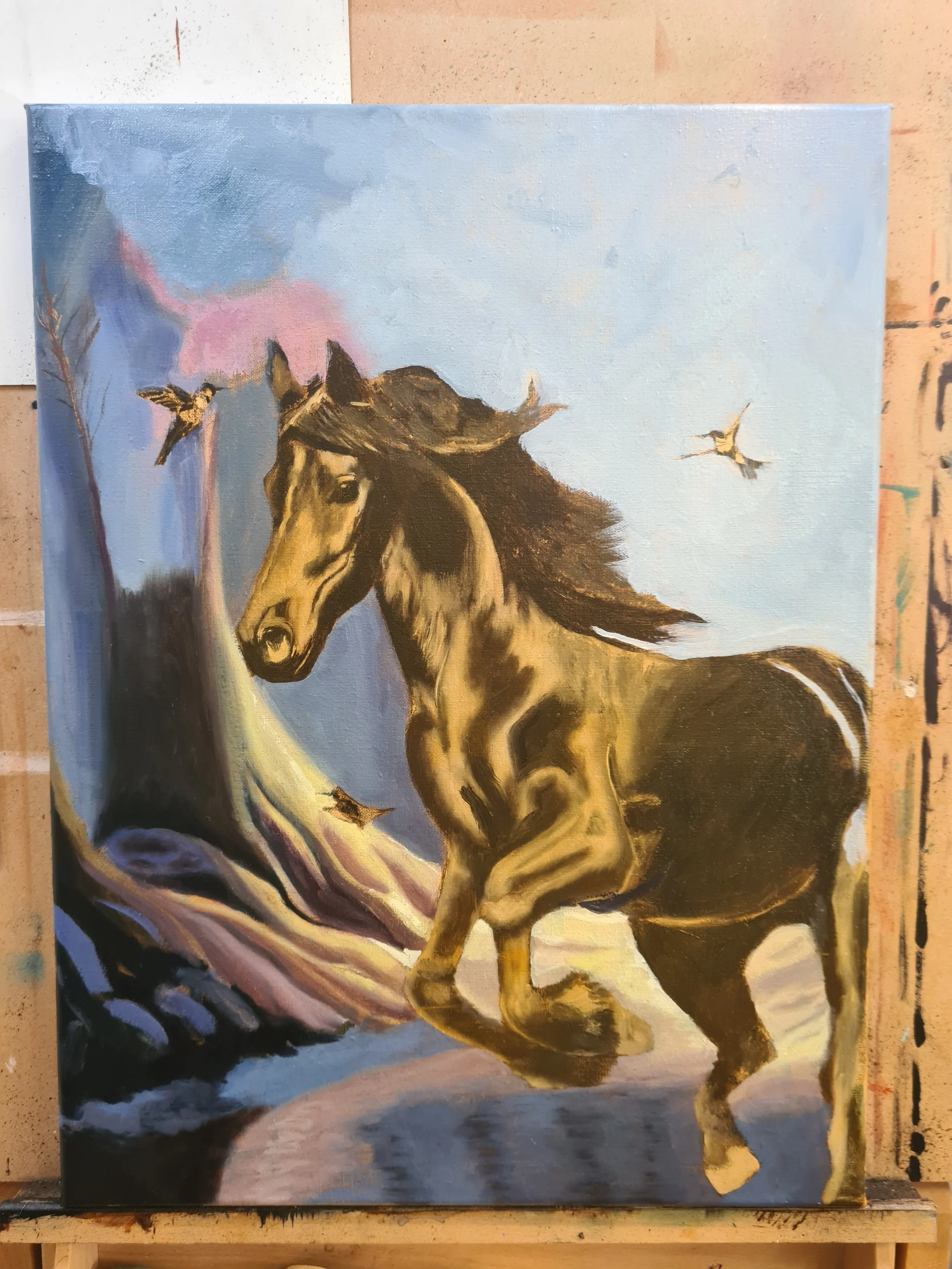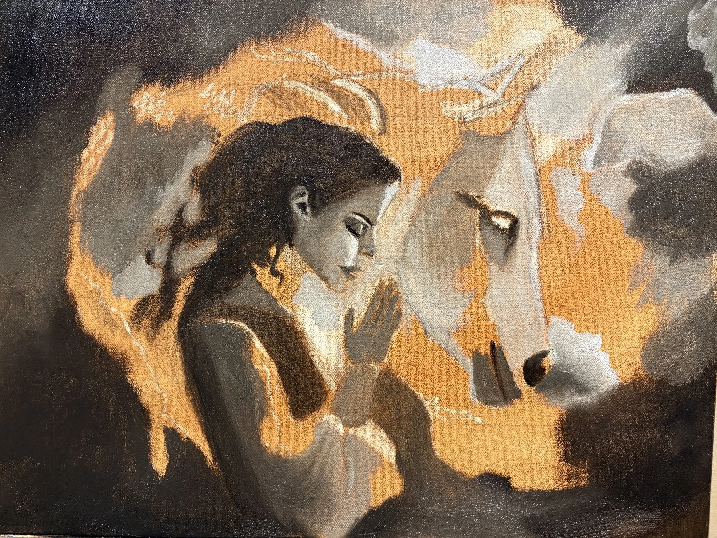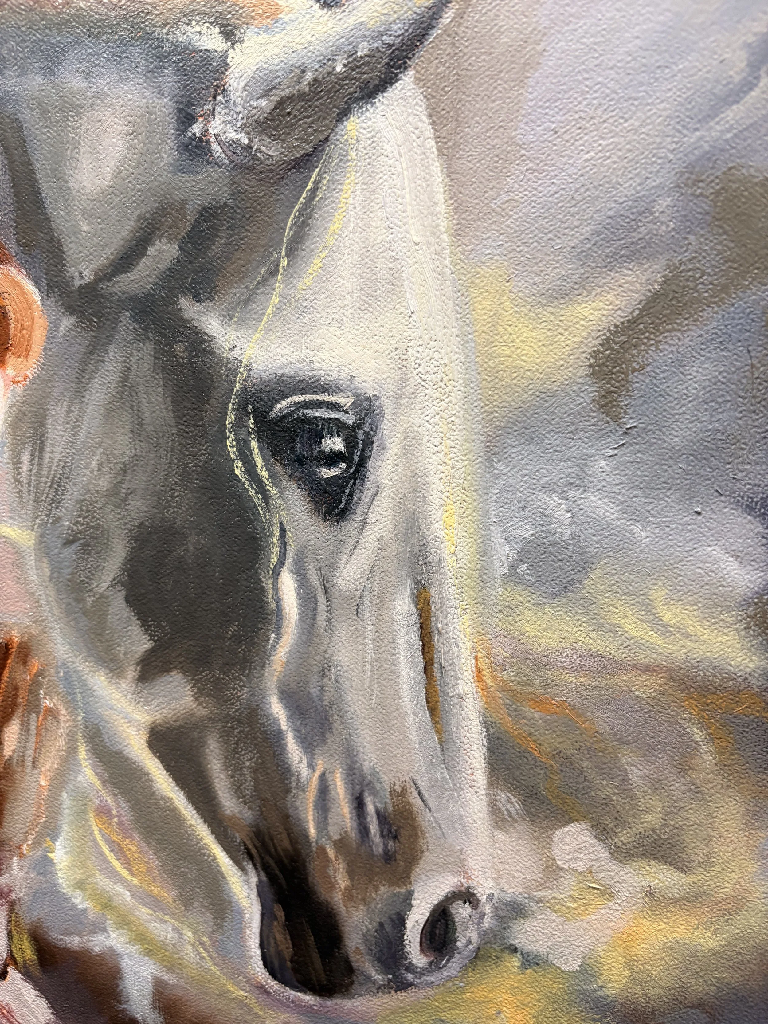 The clouds are still whispering, and the horse is still waiting. This month, I’ve begun refining light across the mane and starting to weave the golden thread toward her, letting it decide its own path on the canvas.
