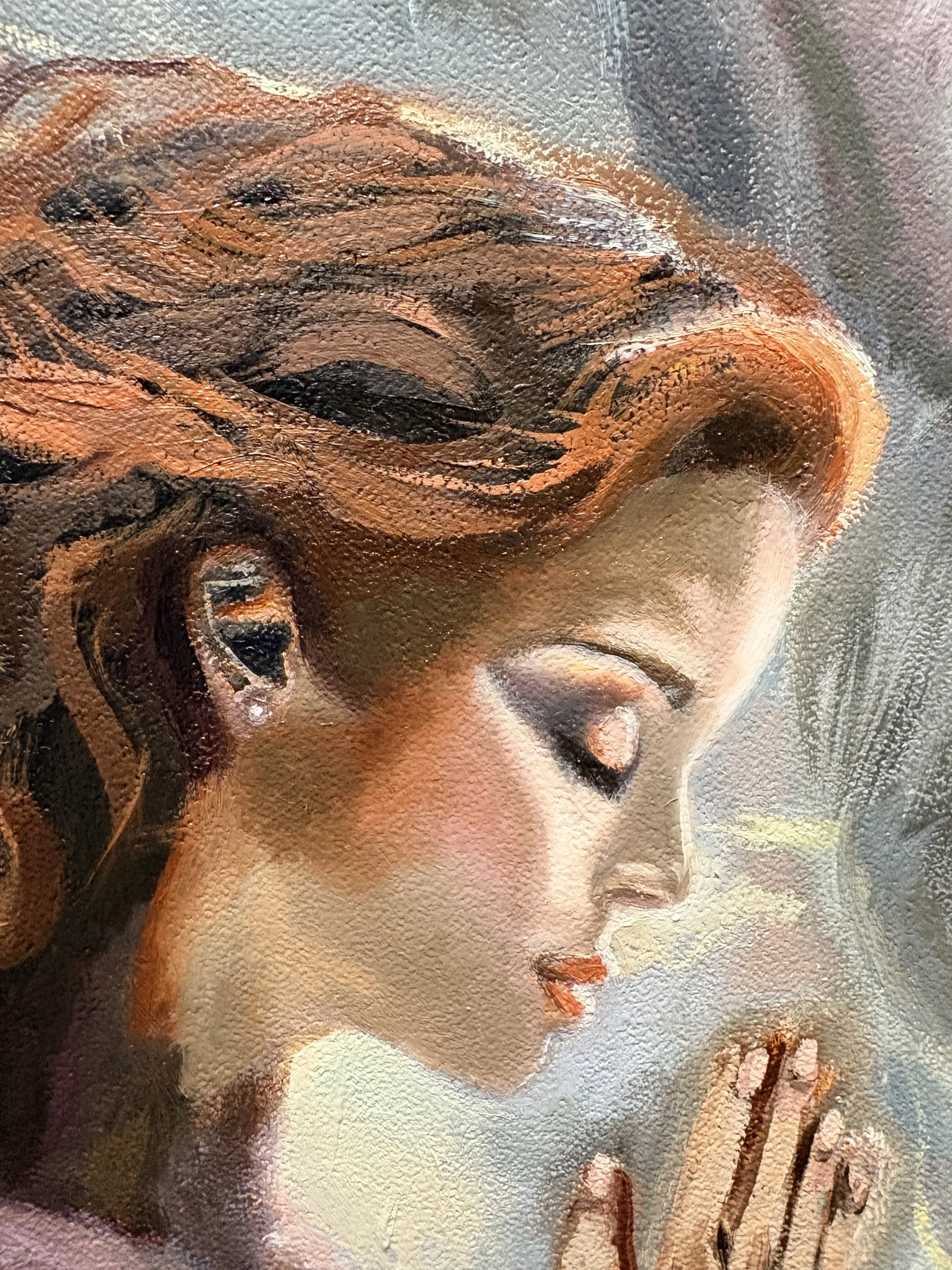 Each brushstroke was built slowly, using traditional glazing methods to create depth, warmth, and spiritual radiance. The result is a piece that feels both ancient and alive - a visual prayer that speaks without words.